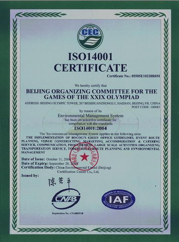 BOCOG awarded again ISO14001 certificate(BOCOG)Updated: 2006-11-09 17:12