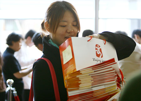 A intern receives new textbooks.The Beijing Organizing Committee for the Games of the XXIX Olympiad (BOCOG) has selected a total of 826 Games-time interns and put their training on its agenda.[BOCOG]
