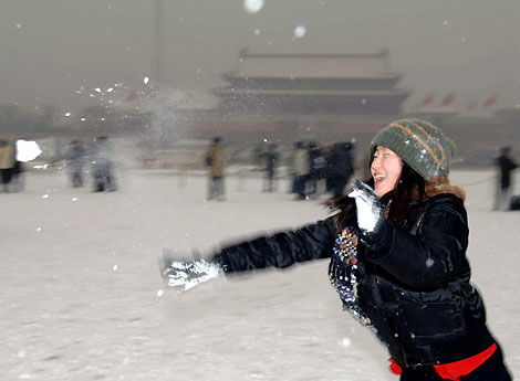 A South Korean tourist plays snow on the Tian'anmen Square in downtown Beijing Saturday as the Chinese capital embraces its first snowfall in this winter December 30, 2006. [Xinhua]