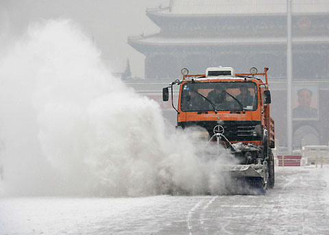 A vehicle clears snow on the Tian'anmen Square in downtown Beijing Saturday as the Chinese capital embraces its first snowfall in this winter December 30, 2006. [Xinhua]