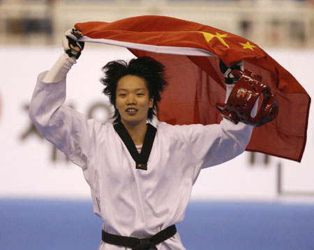 Double Olympic champion Chen Zhong celebrates after she won the world taekwondo championship in the heavyweight (over 72kg) class in Beijing yesterday. She defeated South Korea's Han Jin-sun 6-4. [Xinhua]