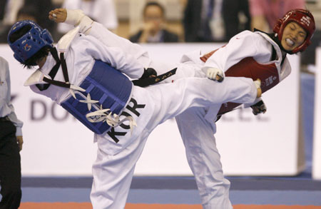 Double Olympic champion Chen Zhong (R) and South Korea's Han Jin-sun exchanges kicks in the heavyweight (over 72kg) class in Beijing yesterday. Chen beat the South Korean 6-4 for the title. [Xinhua]
