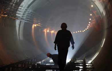 Labourers work at the construction site for the Olympic extension of the Beijing underground system May 13, 2007. More than 10,000 labourers are working to finish 52 new stations and 87 km (54 miles) of tracks that will bring the total length of the subway in Beijing to 300 km (186 miles) and is expected to be finished several months before the start of the 2008 Olympic Games.[Reuters]
