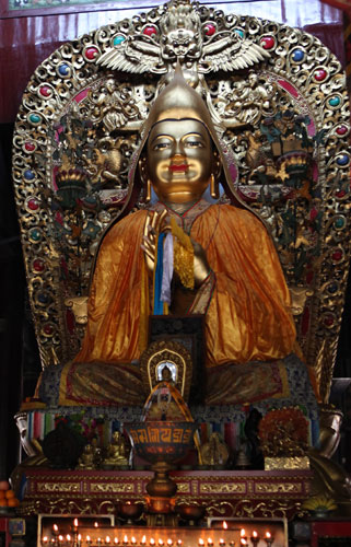 Gold foil paste applied to monk's head. [Photo/China Daily] |