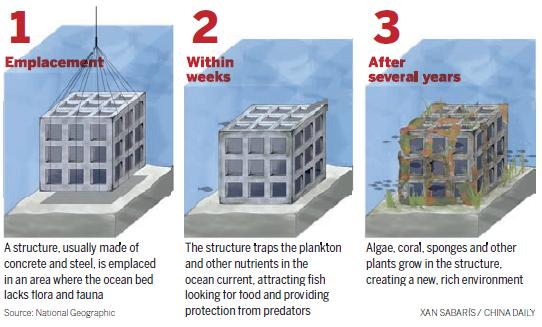 "Fish gather around reefs. That's common knowledge among fishermen," Sun said. "In 2008, we caught fish worth 300,000 yuan ($48,000) in the waters near a 10-meter-long shipwreck, so I believe our artificial reef will attract a lot of fish."