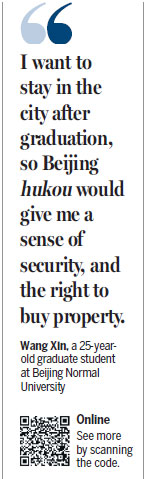 "If I returned to Harbin, I could only get a job with a local TV station at best. The platform in Beijing is much wider," he said. "I want to stay in the city after graduation, so Beijing hukou would give me a sense of security, and the right to buy property. Moreover, if I get married here, my child will be able to attend a public school in Beijing."