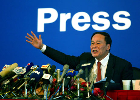 Mayor Wang Qishan speaks to reporters at his first press conference as the mayor of Beijing during the SARS outbreak. [Photo By Wu Zhiyi, Editor Zhu Feng]