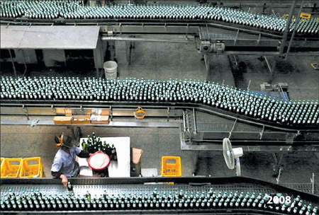 The place where the 1987 black-and-white picture was taken is well known, the industrial town of Jingdezhen, China's ancient pottery and porcelain city. And that's why people still saw a lot of work being done with ancient methods as recently as the 1980s, in quite simple, if not primitive, working conditions. The place where the beer production line was photographed was somewhat of a surprise to Wang Wenlen, our photographer. It was in Chun'an, a scenic and traditional rice growing county on the border between Zhejiang and Anhui provinces. This used to be the territory of huangjiu, a brownish rice wine similar to saki and made according to the local villagers' recipes. But seeing is believing. Many of the younger generation prefer bottled beer now - something that from its very concept to its production process used to be alien to the men and women toiling in the paddy fields. So the economic reform, which Chinese officials say officially kicked off in 1978, has never been as simple as replacing old factories with new ones. Along with industrial capital (a good part of it from abroad) China has also imported a lot of new ways of operating, from business laws to managerial practices. On a deeper level, there was also a change of lifestyles. If consumers are denied many basic choices, as they had been in the 1960s and 70s, who would have invested in a beer brewery? For the planners at that time to produce beer for rice farmers would have been considered a grave mistake, political as well as economic, because farmers were supposed to stick to their rice wine and never switch to urban bourgeois beer. Any attempt to do so would also have been thought of as a waste of precious public resources. But once there is a market and consumer choice is accorded due respect, it's not just that the old factories have vanished but also that new demands and new tastes have appeared at a rate that people could not have imagined. Incidentally, for those who have no idea how advanced some of China's factories can be, it should be pointed out that the beer production line here by no means represents the top level. See the fan? It is still not air-conditioned. Someone in the factory has to plan for more changes.