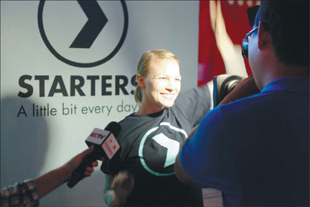 | Above: Krissa Hjartar talks about how Starters is working with networks such as Facebook. Left: Hjartar says her Starters creates a little peer pressure from real friends for users' exercises. Photos Provided to China Daily |