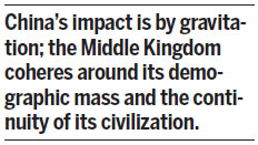 Animated by a conscious effort of rayonnement, or radiation, France aims to federate around what it conceives and enunciates as an enlightening project. By contrast, China's impact is by gravitation; the Middle Kingdom coheres around its demographic mass and the continuity of its civilization.