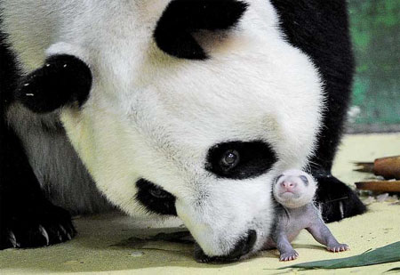 | Tender loving care: Giant panda Juxiao, mother of triplets, plays with one of her babies at Chimelong Safari Park in Guangdong province on Aug 17. Li Ziheng / Xinhua |