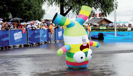 | Head turner: Lele, mascot for the Nanjing Youth Olympic Games, pulls a stunt on the triathlon course on Aug 18. Wang Yuguo / Xinhua |