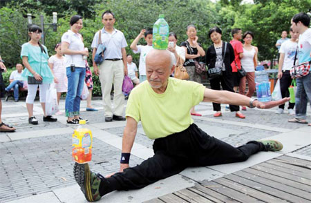 | Aged and agile: An 88-year-old man at full stretch on the banks of the West Lake in Hangzhou, Zhejiang province, on Aug 17. Xu Kangping / for China Daily |