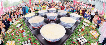 | Superbowl day: Giant dishes of "eight-treasures rice", which contain eight kinds of dried fruits and nuts, during a food and cultural festival in Changji, Xinjiang Uyghur autonomous region, on Aug 17. Li Xiongxin / for China Daily |