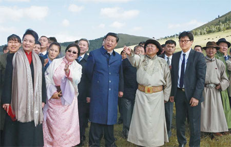 | President Xi Jinping and his Mongolian counterpart Tsakhiagiin Elbegdorj attend the Nadam Fair, a traditional Mongolian pageant featuring entertainment and games, on Aug 22 in Ulan Bator, Ju Peng / Xinhua |