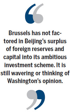 Brussels has not factored in Beijing's surplus of foreign reserves and capital into its ambitious investment scheme. It is still wavering or thinking of Washington's opinion.