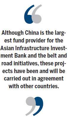 Although China is the largest fund provider for the Asian Infrastructure Investment Bank and the belt and road initiatives, these projects have been and will be carried out in agreement with other countries. Moreover, China does not seek veto power in the projects, and it will certainly not follow the examples set by the Asian Development Bank, World Bank and the IMF.