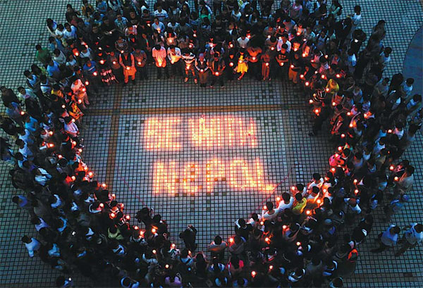 | Nepalese and Chinese students gather on April 25 to pray for Nepal at Nanhua University in Hengyang, Hunan province. International rescue teams and relief supplies began arriving in Nepal's devastated capital on April 26 to help terrified and homeless survivors of a quake that has killed thousands of people in the impoverished nation. Qin Bin / China Daily |