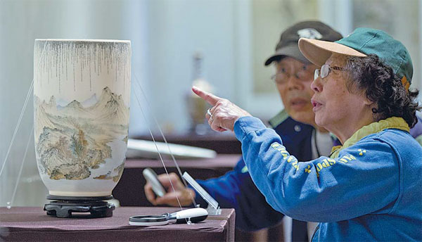 | Visitors examine a contemporary Chinese porcelain piece at the Chinese Cultural Centre in Toronto, Canada, on April 28. Made by artist Wang Zhiwen, the works include miniature Chinese calligraphy that can be read with a magnifying glass. Zou Zheng / Xinhua |