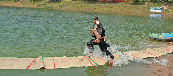 | Walk on water: A man dressed as Pigsy, one of the main characters in the Chinese classic Journey to the West, takes part in a contest offering 1,000 yuan to anyone able to cover a 50-meter track on water, in Changsha, Hunan province, on April 28. Darwin Zhou / For China Daily |