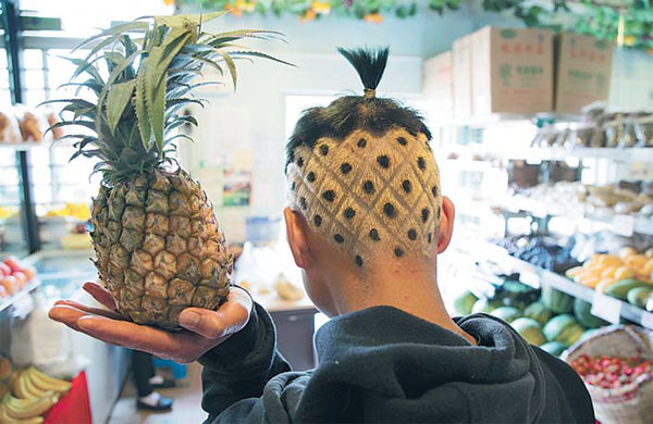 | Tutti fruity: A pineapple seller shows off his new haircut in Kunming, Southwest China's Yunnan province on April 25. Yang Fu / For China Daily |