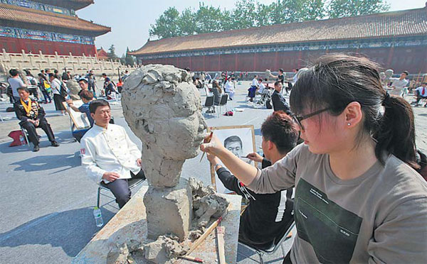 | Model workers: Students from the China Central Academy of Fine Arts create mud sculptures and paintings on April 26 for those who won the title of "Model Workers" in Beijing for May Day. More than 200 students and 100 "model workers" attended the event. Fu Ding / For China Daily |