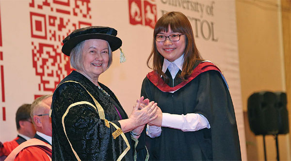 | Baroness Hale, chancellor of the University of Bristol, at a graduation ceremony in Beijing with a Chinese student. Photos provided to China Daily |