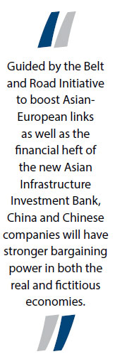 Guided by the Belt and Road Initiative to boost Asian-European links as well as the financial heft of the new Asian Infrastructure Investment Bank, China and Chinese companies will have stronger bargaining power in both the real and fictitious economies.