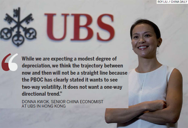 Kwok at UBS, however, predicts volatility. The rate will fall from 6.39 yuan to the dollar on Aug 18 to around 6.5 yuan at the end of 2015 and then 6.6 yuan at the end of 2016, she says.