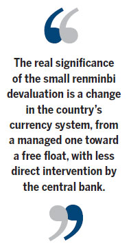 The renminbi devaluation happened as China's export figures were showing sustained weakness, but a change in the renminbi's international value of less than 5 percent will have little impact on the volume of China's exports, and the effect on the country's competitors will be minimal. The real significance of the small renminbi devaluation is a change in the country's currency system, from a managed one toward a free float, with less direct intervention by the central bank.