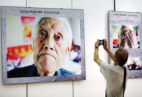 | Face of pain: The photo of a former sex slave on display at an exhibition in Hangzhou, Zhejiang province, on Aug 18. Photos of 70 such women from China and South Korea are on display. The women were forced into sexual slavery at Japanese military brothels during World War II. Lin Yunlong / For China Daily |