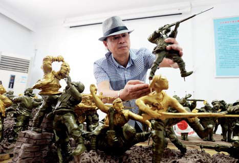 | Heroic figures: Clay sculptures depicting soldiers who fought in the War of Resistance against Japanese Aggression (1937-45) are displayed by sculptor Zhu Jingwei in Nanjing, Jiangsu province, on Aug 16. The figures celebrate the 70th anniversary of the victory in the fight against fascism. Cui Xiao / For China Daily |
