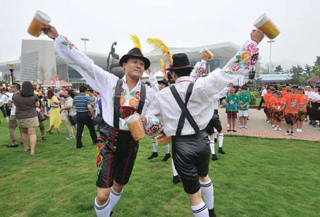 | Sudsy celebration: Local residents dressed in lederhosen and other German-style garb celebrate the opening of the two-week Tsingtao International Beer Festival in Qingdao on Aug 15. Wang Haibin / For China Daily |