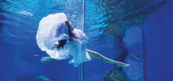 | Body of water: A pole-dancing teacher performs underwater at Haichang Ocean Park in Wuhan, Hubei province, on Aug 14. Wang Zhenwu / For China Daily |