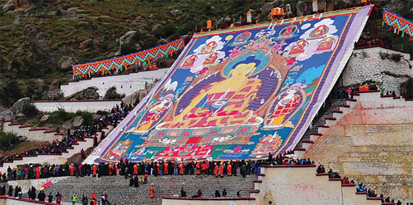 | Big blessing: A Buddha painting unveiled for the annual traditional Shoton (Yogurt) Festival at the Sera Monastery on Aug 14 in Lhasa, capital the Tibet autonomous region. Tenzin Shiten / China Daily |