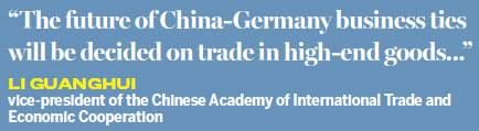 "The future of China-Germany business ties will be decided on trade in high-end goods, and investment in infrastructure projects, high-tech manufacturing and multimodel logistics services," says Li Guanghui, vice-president of the Chinese Academy of International Trade and Economic Cooperation in Beijing,