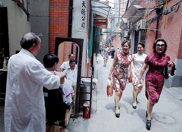| Women in traditional silk Qipao walking in Shanghai's old longtang, or neighborhood. |