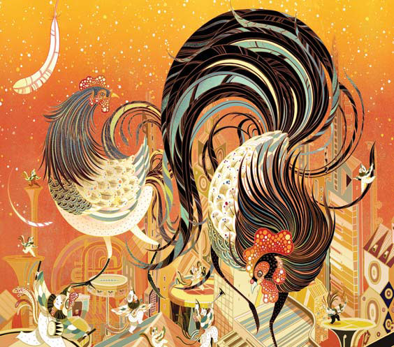 | Above and bottom: Chinese New Year pictures take on a modern look in the creations by young Chinese artists. Photos Provided to China Daily |
