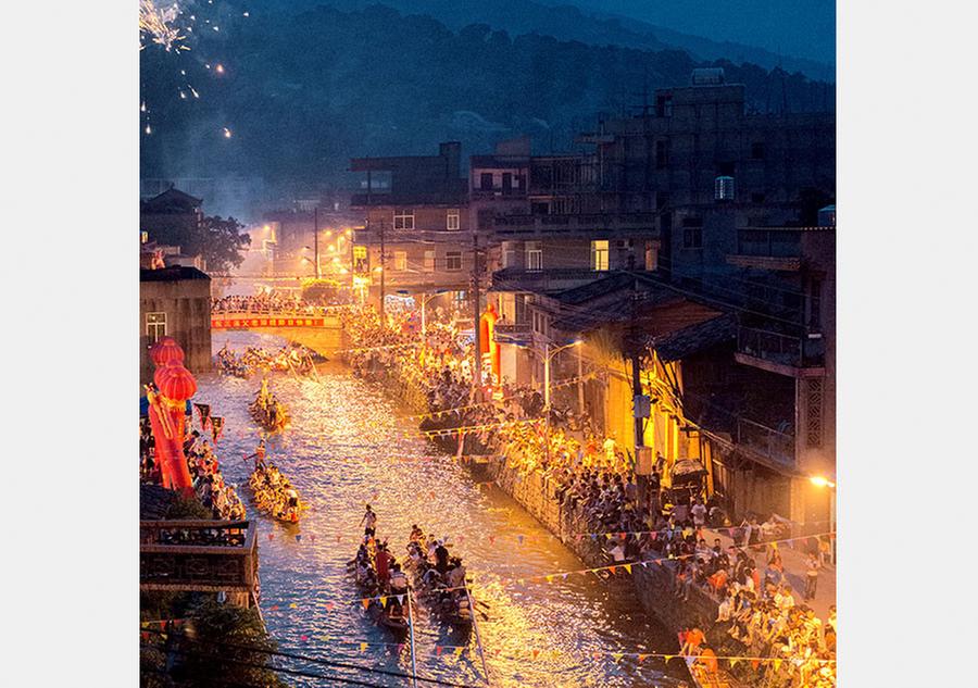 Dragon boat race is held at night in a river town. Photo is taken by Ji Yongxie. [Photo provided by cpanet.org.cn]