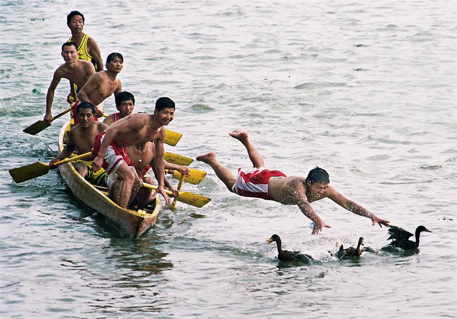 People participate in a game of catching ducks during the Dragon Boat Festival celebration. Photo is taken by Li Longde. [Photo provided by cpanet.org.cn]
