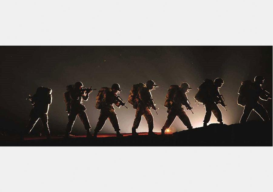 A PLA airborne squad lands at an enemy's rear for battle field reconnaissance during a military drill. Photo was taken by Gao Xiaowen in 2014. [Photo provided by cpanet.org.cn] |