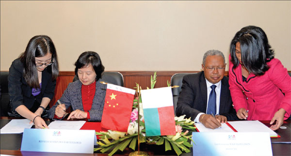 | QUENCHING THIRST: Madagascar's Minister of Water, Energy and Hydrocarbons Lantoniaina Rasoloelison (second from right) and Chinese Agency for International Economic Cooperation representative Ai Yinfang (second from left) sign a memorandum of understanding to fund the drilling of 200 water wells in Madagascar. The signing took place in Antananarivo, Madagascar's capital, on Aug 18. Wen Hao / Xinhua |