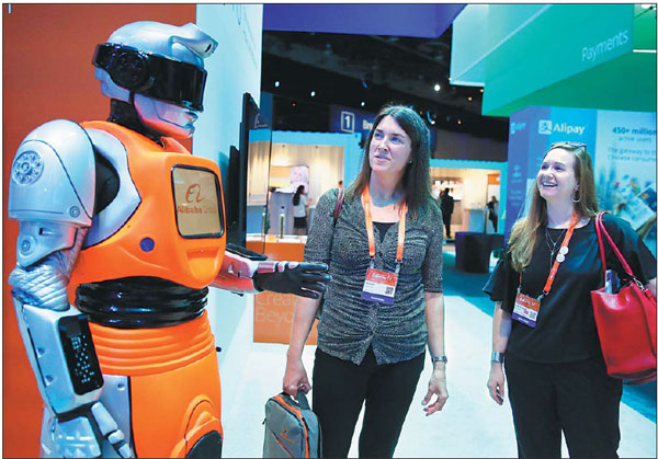 | Visitors talk with an intelligent robot designed by Alibaba Group at an industry forum in Detroit, the United States. Wang Ping / Xinhua |