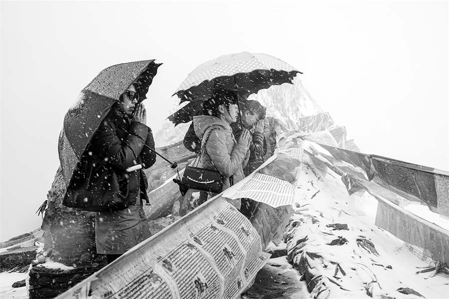 People pray on the snow mountain. [Photo by Wang Weitao/cpanet.org.cn]