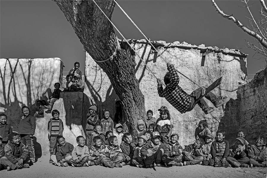 Children wait for their turn on the swing. [Photo by Wang Weitao/cpanet.org.cn]