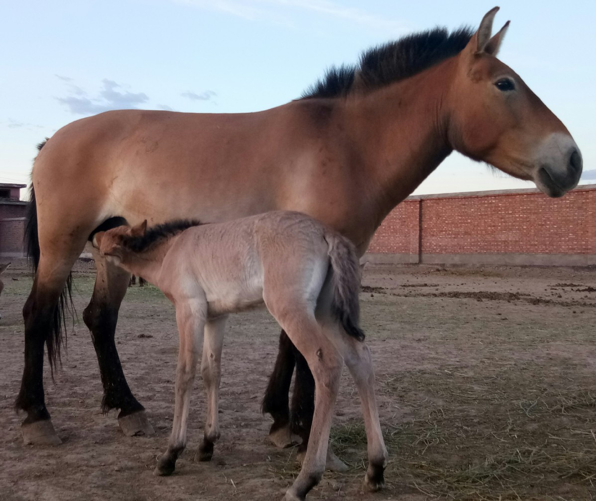 A Przewalski's horse is feeding its foal. [Photo by Zhang Hefan provided for China Daily]