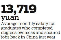 A recent report by Zhaopin, a major online recruitment platform, showed a surge for three years in a row in the average salary for graduates who completed degrees overseas and secured jobs back in China, hitting 13,719 yuan ($2,159) per month last year, up 8.9 percent year-on-year.