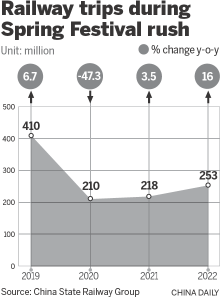 China State Railway Group, the national railway operator, said 253 million trips were made during the 40-day period, up 16 percent compared with last year. In the same period, 420 million metric tons of cargo were handled, a year-on-year increase of 1.4 percent.