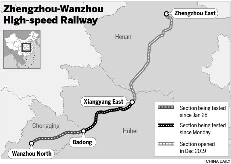 The 818-kilometer line, connecting Zhengzhou, Henan province, and Wanzhou in the southwestern municipality of Chongqing, will halve the travel time between the two cities to four hours. It is expected to open by June.
