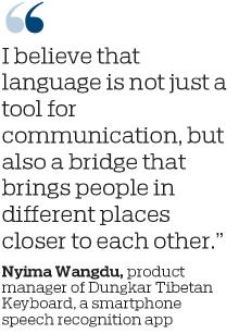 Helping him conquer the language barrier was a smartphone speech recognition app called Dungkar Tibetan Keyboard, which can convert the three main Tibetan dialects-U-Tsang, Amdo, Kamba-into text and translate them into Chinese.